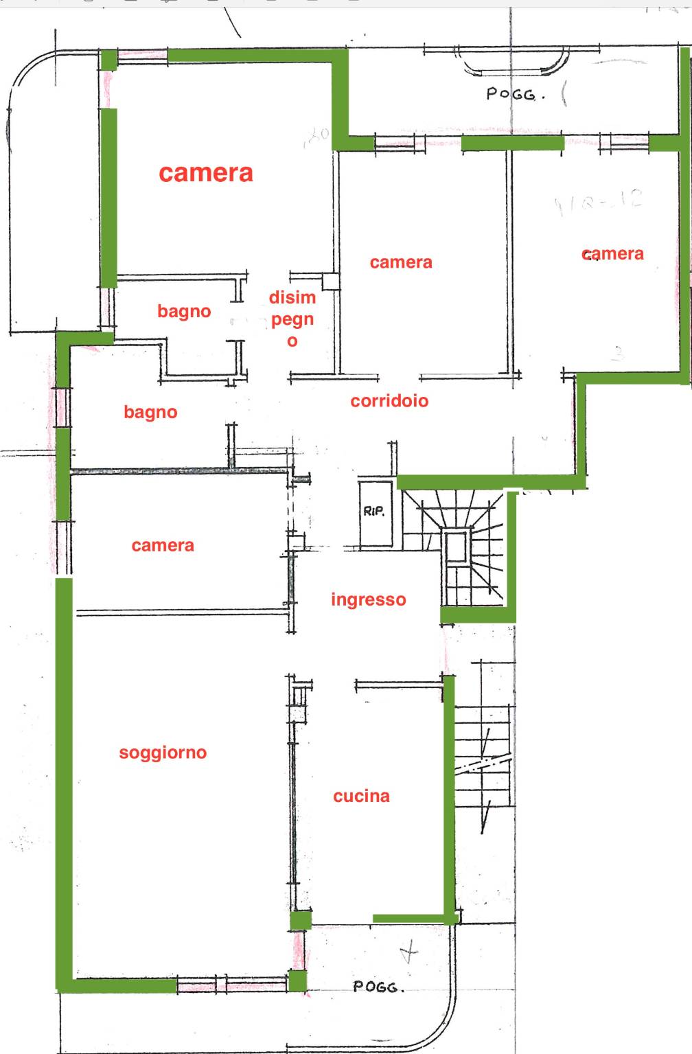 PIANO RIALZATO: Ampio ingresso, soggiorno con caminetto, cucina abitabile con accesso nel poggiolo che comunica anche con il soggiorno, disimpegno notte con armadio-ripostiglio, 4 camere di cui una matrimoniale, due doppie e una singola; la camera matrimoniale comprende il bagno privato e un disimpegno con spazio per un armadio-spogliatoio, un altro bagno a servizio delle altre stanze. I bagni sono entrambi finestrati. Ogni stanza ha il terrazzo